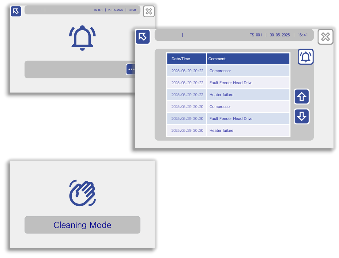- maintenance modes: Automated cleaning mode for efficient upkeep of large machines by one operator.